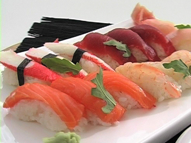 Ловкость рук и нигири-суши готовы!Состав:рис — 100 гр;тунец — 50 гр;лосось — 50 гр;окунь — 50 гр;крабовое мясо — 1 порция;креветки — 3 штуки;несколько листьев салата;соевый соус, васаби, гари — по вкусу.